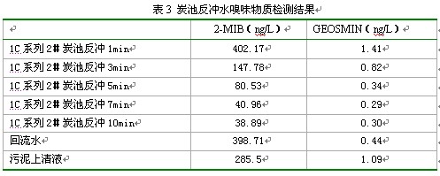 由(you)(you)于(yu)一(yi)期(qi)進水(shui)嗅(xiu)(xiu)味物質比原(yuan)水(shui)濃度高(gao)將(jiang)近(jin)一(yi)倍,再次(ci)對(dui)炭(tan)池(chi)(chi)反(fan)沖(chong)洗排(pai)水(shui)進行檢測,結(jie)果如(ru)表(biao)3所示。反(fan)沖(chong)初(chu)始2-MIB濃度較(jiao)高(gao),說(shuo)明水(shui)沖(chong)也可以起(qi)到(dao)釋放(fang)活性炭(tan)吸附(fu)的污染物,恢復(fu)部分炭(tan)吸附(fu)能力的作用。基于(yu)分析結(jie)果,決定將(jiang)炭(tan)池(chi)(chi)反(fan)沖(chong)周期(qi)由(you)(you)原(yuan)6天一(yi)次(ci)縮(suo)短到(dao)3天一(yi)次(ci),緩解由(you)(you)于(yu)炭(tan)吸附(fu)飽(bao)和后的嗅(xiu)(xiu)味穿透。