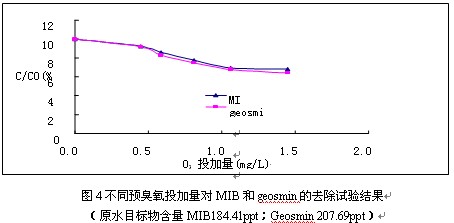 由(you)圖4可以看(kan)出,預(yu)臭氧(yang)對MIB和geosmin的去(qu)除(chu)效(xiao)率較低,在預(yu)臭氧(yang)投量(liang)達1.5ppm條件下,MIB和geosmin僅能去(qu)除(chu)25%左右。從試驗結果和設備購置周期(qi)的角度分析(xi),臭氧(yang)氧(yang)化技術不宜作為應急(ji)技術方案。