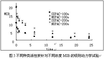在(zai)粉末(mo)(mo)炭(tan)(tan)選型(xing)時(shi),煤質活(huo)性炭(tan)(tan)比(bi)木質炭(tan)(tan)更易沉(chen)降,而(er)且價格(ge)便(bian)宜(yi)。根據九廠在(zai)用的(de)(de)顆粒活(huo)性炭(tan)(tan)指(zhi)(zhi)標確(que)定(ding)了粉炭(tan)(tan)指(zhi)(zhi)標參數(shu),粒徑為200目。通(tong)過對兩(liang)家(jia)炭(tan)(tan)廠生產的(de)(de)煤質粉末(mo)(mo)炭(tan)(tan)進行(xing)嗅味(wei)物(wu)質吸(xi)(xi)附試驗,發現(xian)相同指(zhi)(zhi)標的(de)(de)SX炭(tan)(tan)效果較優,高濃(nong)度吸(xi)(xi)附效果比(bi)NX炭(tan)(tan)顯示(shi)出更強的(de)(de)優勢(shi)。隨著吸(xi)(xi)附時(shi)間的(de)(de)延長,兩(liang)種炭(tan)(tan)的(de)(de)差(cha)異逐漸(jian)縮(suo)小,見圖5