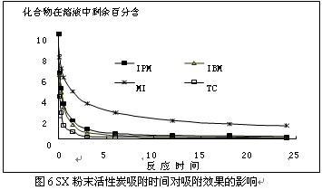 粉炭(tan)投加點可(ke)設在(zai)(zai)水源處、混凝前和濾池前7。通過進(jin)行(xing)粉末炭(tan)對不(bu)同嗅味(wei)物(wu)質吸附(fu)(fu)(fu)動力學試驗曲線,可(ke)以看出MIB需要較(jiao)長時間(jian)進(jin)行(xing)吸附(fu)(fu)(fu)才能達到平(ping)衡(heng)。雖然(ran)粉末炭(tan)對這些痕量(liang)目標(biao)化合物(wu)的(de)去除主要在(zai)(zai)1小(xiao)時之(zhi)內的(de)吸附(fu)(fu)(fu),之(zhi)后的(de)吸附(fu)(fu)(fu)速率(lv)有所降低(di),但如有條件延(yan)(yan)長吸附(fu)(fu)(fu)時間(jian)將(jiang)會使嗅味(wei)物(wu)質濃度進(jin)一步降低(di),提高吸附(fu)(fu)(fu)效率(lv),見(jian)圖(tu)6。據(ju)此(ci),九廠應考慮在(zai)(zai)密云取水站投加,以延(yan)(yan)長粉末炭(tan)對嗅味(wei)物(wu)質的(de)吸附(fu)(fu)(fu)時間(jian)。