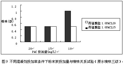 MIB和geosmin在(zai)天然水體中的去除率(lv)與其初始濃(nong)(nong)度(du)無關(guan)(guan),根(gen)據(ju)需要降低到的目標濃(nong)(nong)度(du),利用吸附特(te)性(xing)曲線,計算出實際(ji)需要的PAC投(tou)加(jia)(jia)(jia)量(liang)(liang)。粉末(mo)炭投(tou)加(jia)(jia)(jia)量(liang)(liang)與嗅味關(guan)(guan)系試驗圖可知,在(zai)一個給定(ding)的粉末(mo)炭投(tou)加(jia)(jia)(jia)量(liang)(liang)和吸附時(shi)間(jian)后,痕量(liang)(liang)嗅味物質的去除率(lv)與開(kai)始濃(nong)(nong)度(du)無關(guan)(guan),必須考慮過(guo)量(liang)(liang)投(tou)加(jia)(jia)(jia)。經(jing)試驗15mg/l與20mg/l粉末(mo)炭的處理效(xiao)果相當,投(tou)加(jia)(jia)(jia)量(liang)(liang)確(que)定(ding)15mg/L,見圖9。凈水藥劑(ji)采用聚(ju)合氯化(hua)鋁,投(tou)加(jia)(jia)(jia)率(lv)20mg/L,即使在(zai)粉末(mo)炭投(tou)量(liang)(liang)稍少的情況下(xia)嗅味仍為一級弱,去除嗅味效(xiao)果穩定(ding)。