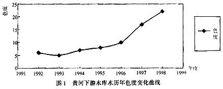 試驗所在G水廠位于黃河最下游入海口附近,源水為水庫蓄積的豐水期取自最下游的黃河水,而目前黃河下游受到的污染卻日益加重;黃河頻繁斷流,并且斷流時間越來越長,1997年達到了280天,水庫中蓄積的作為飲用水源的黃河水貯存周期越來越長;水庫上游及周邊的工農業的不斷發展,排入水體中未經處理的工業廢水和居民生活污水不斷增多,這一切導致污染問題日漸突出,有機污染物、氨氮、藻類、嗅味等污染指標的增高,同時,水廠出廠水的濁度高居不下;源水中的污染也導致了近年來水中色度逐年增高。圖1為該水庫歷年色度的變化曲線。如何強化污染水的濁度去除效果、降低出廠水中的色度,對污染源水進行深度處理,進一步改善供水水質是許多水廠面臨的重大水質難題之一。