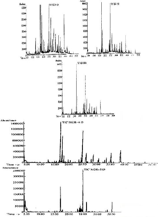 XGR-1D,XGR-2D,XGR-3D,XGR-4D,XGR-5D分別為源水、單獨投加聚合氯化鋁、預氯化與聚合氯化鋁共同處理、高錳酸鉀預處理與聚合氯化鋁共同處理、高錳酸鉀復合藥劑預處理與聚合氯化鋁共同處理后的濾后水的重建總離子流質量色譜圖。