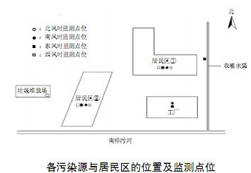 由于該排污河水體污染嚴重,流動性較差,厭氧菌大量繁殖,降解水中有機污染物時會產生惡臭氣體。農灌水渠引南排污河河水,位于居民區①東側約100m處,寬約3m,伴有惡臭氣味。垃圾堆放場距離居民區②約 400m,主要收集周圍居民區的生活垃圾,垃圾在厭氧降解的過程中會產生惡臭氣體。