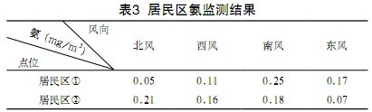 由表3可知,居民區①南風、東風、西風時氨的濃度明顯高于北風本底值,由高到低依次排列為南風>東風>西風>北風,說明各污染源排放的氨對于居民區①均有一定的影響,尤其是南風時超出標準限值,說明焦化廠對居民區①的氨污染較為嚴重;居民區②的氨濃度由高到低依次排列為北風>南風>西風>東風,北風本底值高于其他風向,可能是居民區②的北方存在其他的污染源,例如生活垃圾、旱廁、堆肥等都可能構成惡臭污染源,還需進一步排查確定,東風時氨的濃度較低,說明焦化廠對居民區②的氨污染較小。