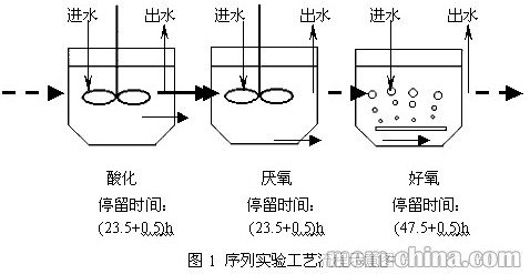 序列實驗如圖1所示。酸化反應器及厭氧反應器的體積均為1L。水力停留時間為酸化24h,厭氧24h,好氧48h。各反應器中污泥濃度均為3000~3500mg/L,室溫下反應。