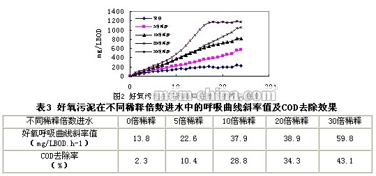 為研究不同稀釋比對污泥活性的影響,利用BOD測定了不同進水條件下的污泥呼吸速度曲線(圖2)。圖2中各曲線的斜率列于表3。可以看出,廢水經稀釋后污泥的呼吸速度有明顯的改善,稀釋10倍至30倍可以有效地減少廢水中有毒物質對污泥活性的影響。在后續的序列處理實驗中,廢水稀釋比確定為20倍稀釋。