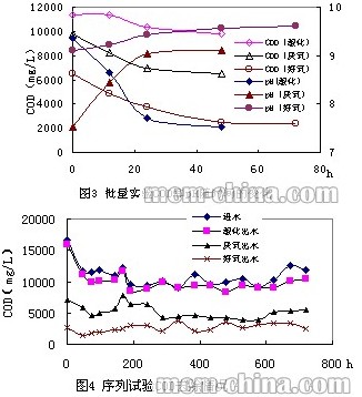 圖3顯示了在酸化、厭氧、好氧批量處理中COD與pH的變化。廢水的稀釋倍數為20倍。可以看出,在酸化水解和厭氧處理過程中,COD與pH基本上在反應24小時后達到一個穩定的水平,而在好氧處理過程中,反應需要48小時才能完成。因此,在后續的序列處理實驗中酸化、厭氧、好氧處理的HRT分別確定為24、24、48小時。