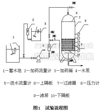 試驗采(cai)用(yong)投加絮凝(ning)劑進行壓(ya)力式(shi)直接過濾(lv)的方(fang)法,工(gong)藝流(liu)程見(jian)圖1。原水為粘(zhan)土和淤泥自配水。過濾(lv)器直徑Ф800mm,碳鋼焊制(zhi),上下隔(ge)板間距(ju)2.8m。采(cai)用(yong)聚合氯(lv)化鋁(PAC)溶液為絮凝(ning)劑,投加量5-8mg/L,接觸絮凝(ning)時(shi)間1-3min。濾(lv)速(su)范(fan)圍20-100m/h,操作壓(ya)力0.04-0.35MPa,出水濁度≤1NTU。采(cai)用(yong)氣-水聯合方(fang)式(shi)進行反沖洗。