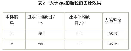 (1) 分(fen)別取過濾器進出水水樣(yang),用顯微(wei)圖像儀記錄(lu)水中顆粒(li)狀況,采用劃線計數(shu)法直(zhi)接測(ce)量水中大(da)于(yu)(yu)2μm粒(li)子的個(ge)數(shu)。對(dui)大(da)于(yu)(yu)2μm的顆粒(li)的去除效果見表(biao)2[4]。