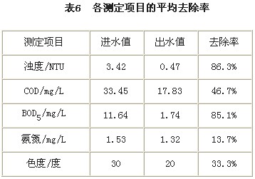 該工藝為(wei)對二沉池出(chu)水投(tou)加絮(xu)(xu)凝(ning)劑后直接過(guo)濾。過(guo)濾器直徑Ф800mm,濾速40m/h,采(cai)用(yong)氣-水聯合反沖洗,絮(xu)(xu)凝(ning)劑為(wei)聚合氯化鋁,投(tou)加量2-8mg/L。表(biao)6為(wei)各測定項目的平均去(qu)除率情況。