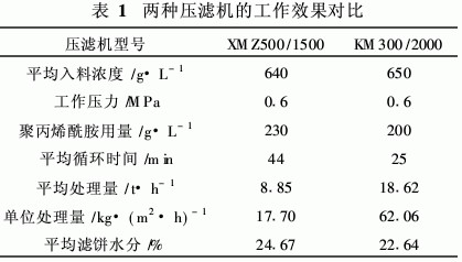 (3)工作效果。XMZ500/1500壓濾機與 KM300/2000壓濾機工作效果對比見表1。