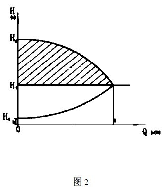 圖1中設定HAA 為恒速泵的H - Q 曲線,A 為工作點,OH1A 為管道工作特性曲線,其計算式為h1 = h + KQ21,HO 為最不利配水點幾何高度及自由水頭,H1A 為設定的定壓線,HBB、HCC ?為水泵變頻調速后,在各轉速n1 、n2 ?時相應的Q - H 曲線。當流量由QO 降到Q1 時,恒速泵揚程必然上升至B’點。在變頻調速恒壓變量工作方式下可比恒速泵蓄能BB’段。若流量繼續下降到Q2 、Q3 ......,壓力保持在H1 不變,水泵轉速對應變為n2 、n3 ......,則節能值分別為CC’、DD’......。變頻調速恒壓變量給水系統比恒速給水系統節能如圖2 中陰影部分所示,這就是變頻調速恒壓變量給水系統的節能原理。