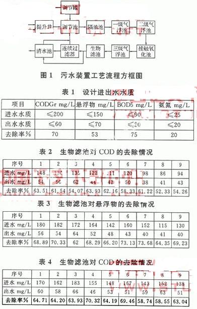 從表六、表七可以看出,經過反沖洗后,生物濾池的出水水質基本上穩定在排放標準的邊界上,偶爾也有超標現象,針對這一問題,我們優化工藝,控制生化的水溫、PH值、溶解氧等工藝參數,降低生物濾池進水的COD、BOD負荷,污水經過曝氣生物濾池、連續過濾器后,污水實現了達標排放的目標。