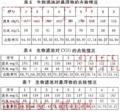 從表四、表五可以看出,隨著運行周期的延長,生物濾池對COD、懸浮物去除能力逐間降低,甚至出現了出水指標不合格現象。
