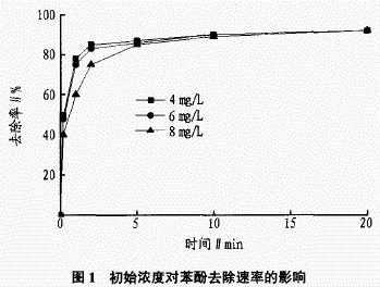 在苯酚初始濃度為4,6 mg/L時,在開始2—3 min,苯酚濃度下降很快,苯酚去除率達到82%左右,而苯酚濃度達到8mg/L時,則在反應6 min時才達到相同驅除率,水溶液中苯酚濃度高時,反應生成中間產物,并且消耗掉一定量的二氧化氯,影響了苯酚的去除。初始濃度為8 mg/L的苯酚溶液,在反應20 min后,去除率達到93%,這說明二氧化氯用量是決定苯酚去除率的主要因素,也說明對苯酚的去除是十分有效的。