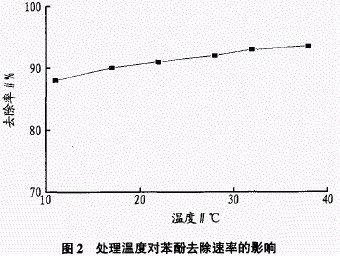 廢水處理溫度的高低,直接影響著處理裝置的復雜程度和處理費用。若要求處理溫度較高時,處理低溫廢水就需要加熱設施,這不僅使處理裝置復雜和處理操作麻煩,而且也增加了設備投資和運行費用。處理時間為20 min,考察處理溫度對去除率的影響,結果見圖2。隨處理溫度的升高,苯酚去除率提高,但影響不大,在l0℃時,處理20min,苯酚的去除率達87%以上。這表明利用二氧化氯處理含酚廢水不要求高的處理溫度,不必增添加熱設施,低溫下也有較好的處理效果。