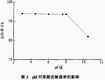 配置苯酚溶液,當pH值小于8時,苯酚去除率變化不大,但當溶液pH值大于8時,苯酚去除率明顯下降。因此,利用二氧化氯處理含苯酚廢水應控制廢水pH值小于8(圖3)。