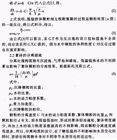 我國東北地工全年有四、五個月的時問處于寒冷季節,水體被冰層覆蓋.江河水溫0—1℃,水庫水下層水溫2~4℃。這個時期原水濁度也很低,江河水為5-30NTU,而水庫水也只有5-10NTU。原水水溫低,水的動力粘度系數提高,減弱了水中膠體的顆粒運動,降低了他們之間相互碰撞的機率;水中膠體的溶劑化作用增強,顆粒周圍的水化膜加厚,妨礙顆粒凝聚;同時,通過混凝所形成的絮體較輕,不易下沉,難以通過沉淀從水中分離出去。