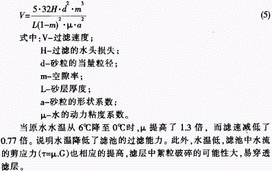為保證濾后水質,濾池不應承擔較大的負荷,就是采用接觸過濾工藝.也要求原水的濁度和色度均不得大于25度;而普通快濾池的濾前水濁度更是要求在1O度以下,濾速不大于8m/h,濾后水才能達到新的飲用水水質標準。水溫對于過濾過程的影響可由下式表示: