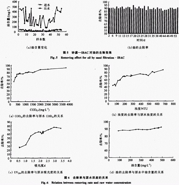砂濾一IBAc工藝能較好地去除水中油脂及其他有機物,其對CODcr的去除率為55%~92% ,而一般的物理化學法,如混凝法,對c0Dc 的去除率僅為60% ~75%[15,16];該工藝對水樣的CODcr平均去除率為77.20% ,對水中油的平均去除率為86%,也達到了其他傳統生物處理方法的處理效果[1]。