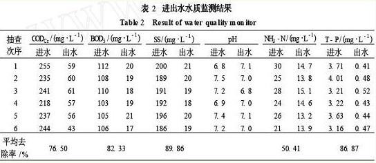 工程運行期抽查了部分運行參數,見表2。通過多次監測,其出水水質達到了( GB8978- 1996)一級排放標準。