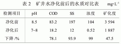 通過井下一體化凈化與復用系統的研制,不 僅解決了在地面凈化礦井水時的二次污染問題, 還取得了一定的經濟與社會效益。與地面建礦井 水處理站相比,投資減少106萬元;凈化后的礦井 水,在井上下利用3 000 t/d,每年可減少地下水資 源消耗、能源消耗等280萬元/a;在社會效益方 面,較好地保護了礦區的自然環境。