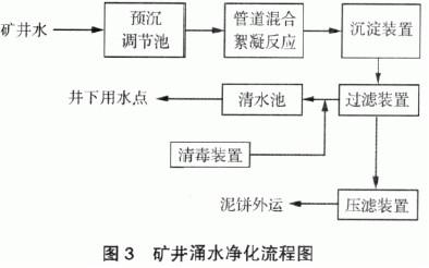 700外水倉的礦井涌水經提升泵抽吸入主 水管,礦井涌水進入水管即加聚合氯化鋁(含部分 非礦凈水劑)進入管道混合器,礦井涌水在主水管 道中迅速與聚合氯化鋁混凝,主供水管與3臺凈 水設備的3根供水支管相通,礦井涌水進入3臺 全自動一體化凈水器,進入凈水器的礦井涌水自 下向上流動,混凝效果逐漸加強,礬花由小聚大, 進入斜管沉淀區后,在斜管作用下,聚大的礬花下 滑沉入沉淀區,在斜管區完成泥水分離,分離后的 清水向上進入水箱,水箱內清水向下由配水管送 入6個雙介質過濾池。經過濾的水進入輸水管道 經ClO2殺菌后輸入清水池。