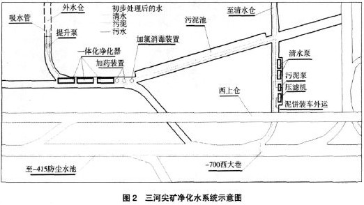 利用井下水倉就地處理污水,避免將污水送到地面時造成二次污染。另外,將外水倉兼作初次沉淀池處理,處理后的水直接用于井下,免去將污水提升到地面處理后再送人井下利用的動力、管材等浪費。同時可免去地面重修沉淀池。三河尖礦凈化水系統示意圖如圖2所示。