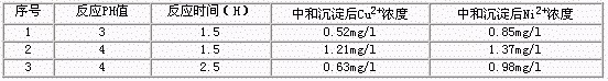 注:在酸性溶性中:HOCl+H++2e→Cl-+H2O,E=1.49V;在堿性溶性中:OCl-+H2O+2e→Cl-+2OH-,E=0.9V;在中性溶液中,E=1.2V,經多次試驗發現,其絡合廢水中的Cu2+、Ni2+濃度隨氧化反應的時間及酸度成正比,反應時的PH值越低,反應時間越長,則處理效果愈好。如表2所示: