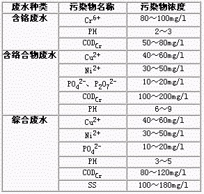 廢水設計處理量為60m3/h,其中含鉻廢水(主要為粗化及鍍鉻環節產生的廢水)25m3/h,含絡合物廢水(主要為鍍焦銅、化學鍍銅、化學鍍鎳廢水等含絡合物的廢水)10m3/h,綜合廢水(即酸洗、除油及電鍍類廢水)25m3/h。具體水質如表1所示: