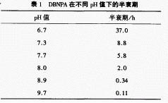 DBNPA的水溶液在酸性條件下比較穩定。在堿性條件下容易水解,提高pH值,其水解速度加快,DBNPA在不同pH值下的半衰期見表1[5]。DBNPA在自然水體中依次降解為2一溴一3一次氮基丙酰胺、氰乙酰胺、丙二酸,最終降解為溴離子和二氧化碳。此降解過程所產生的中間產物及最終產物毒性均符合有關的環境標準,對水質無污染。加熱、紫外線和熒光照射都可以使其分解速度大大加快。此外,日光及土壤微生物也能讓DBNPA分解成為無害的物質。