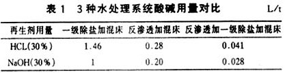 改進的反滲透系統延長了制水運行周期,節省了酸、堿用量。采用反滲透加一級除鹽系統加混床后,其顯著優點是一級除鹽系統的運行周期成倍增加,再生次數大大減少,節省大量酸、堿。原一級除鹽運行周期6 h,而采用反滲透加一級除鹽系統加混床后,一級除鹽運行周期達8~10 d,周期制水量從240 t增至8 600 t左右,混床運行時間可達1個月以上。