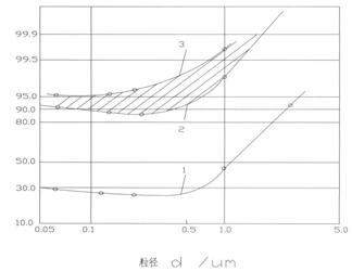 ![]() 圖2 濾料在不同狀態下的分級除塵效率 1—清潔濾料;2—振動清灰后的濾料; 3—積塵的濾料 |