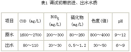 為縮短系統調試周期,采用好氧生物膜的培養和馴化與厭氧污泥的同時進行,各單元均設置了超越管以利于調試。調試期間好氧污泥先后接種了兩次,第一次接種的是某酒廠的酒糟廢水生化處理系統的好氧污泥,由于當時廠里排放的全是硫化黑廢水,使進水的硫化物濃度過高,故好氧污泥的培養十分困難,后來對預處理系統做了較大調整,而且有針對性地提高了FeSO4及脫色劑的投量,使好氧污泥得以繼續培養。