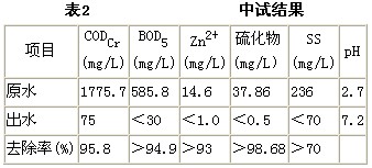堿性和(he)酸性廢(fei)水按1∶2.5混(hun)合(he),經處理后出水水質能達到國家一級(ji)排放標準。試驗結果見表2。