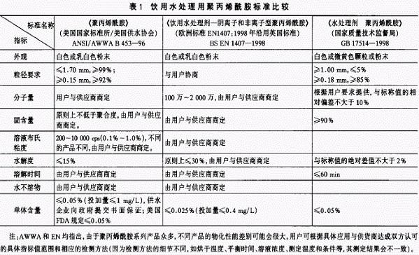 我國現行有效的PAM 產品標準為《水處理劑聚丙烯酰胺》(GB17514-1998),現將其同美國和歐盟的標準作一比較(見表1)。