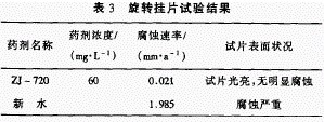 試驗結果表明:在上述水質條件下,如不加緩蝕阻垢劑處理,腐蝕及結垢嚴重;而加全有機高效緩蝕阻垢劑ZJ一720處理后,腐蝕速率僅為0.02lmm/a,遠低于腐蝕速率為0.07mm/a的試驗指標。