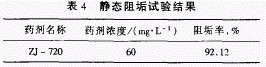 結果顯示:在易結垢的水質情況下,全有機高效緩蝕阻垢劑ZJ一720的阻垢率可高達92.12% ,說明ZJ一720具有優異的阻垢效果。