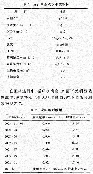 獨山子分公司煉油廠二循環水廠于2001年12月開始用全有機高效緩蝕阻垢劑ZJ一720替代原有配方。循環水水質數據始終保持在表6中的數據范圍內。