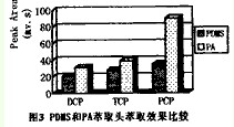 目前應用較多的三種多聚物涂層百非極性的聚二甲基硅氧烷(PDMS)和極性的聚丙烯酸酯(PA)或聚乙二醇(PEG)[4]。PDMS涂層通常用于非極性化合物的分析,PA涂層通常用于中極性化合物的分析,我們比較了同一氯酚混標樣在PDMS和PA兩種不同萃取頭作用下的測定結果(見圖3),結果表明PA萃—取頭對酚類的萃取效果更好[9]。