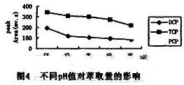 三種氯酚均屬于弱酸,其離解常數pka如下:2,4-DCP(pka =7.85),2,4,6-TCP(pka=7.42),PCP(pka=4.74),在pH為中性的溶液中,氯酚都有離解,能形成離子狀態,不利于萃取。降低pH值,能使它們的電離受到抑制,以保持氯酚的分子狀態,使其在固相涂層上有更大的親和力,從而增加萃取量,同時也提高了回收率。文獻[10]中反映,當pH低于2時,萃取平衡時間將大大延長,pH=1時,PCP甚至在4h后才能達到平衡,考慮到實際應用,實驗中我們測定了同一氯酚混標樣在pH=2至pH=6值時的萃取效果(見圖4),結果表明,pH值取2時,三種氯酚的萃取效果最佳。