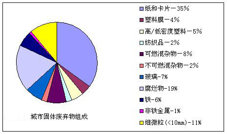 城市固體廢棄物中紙和卡片約占35%,塑料約占9%,紡織品約占2%。