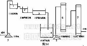 1、工藝(yi)流程:根(gen)據青甸湖水(shui)源水(shui)有機物(wu)含量高,呈富營養化(hua)狀態的水(shui)質特點(dian),在紹興市自來水(shui)總公司(si)青甸湖取水(shui)口(kou)建立了(le)一套小試裝(zhuang)置,其流程如圖2-1所(suo)示: