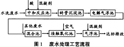 染料水洗廢水、鈷酞菁水洗廢水經管道收集直接自流入中和反應池,中和反應池上安裝混凝劑投加裝置及攪拌裝置,經調整pH值后,用泵將廢水打入斜管沉淀池,出水自流入電解氣浮池。
