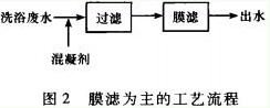 研究表明,超濾膜不僅對洗浴廢水中懸浮物、大分子有機物有較好的去除效果,而且對預處理難以通過絮凝、過濾去除的陰離子洗滌劑也有較好的截留作用。此外,將高效膜分離技術與傳統的活性污泥法相結合的新型水處理反應器系統一膜生物反應器(MBR),也在處理洗浴廢水中得以應用。張洪國等利用膜濾法處理洗浴廢水,研究結果是膜濾出水水質優于纖維過濾和微絮凝的出水水質,且操作簡單、易實現自動化、占地面積也小、適合于賓館飯店等洗浴廢水處理,膜濾技術精度高,能去除大部分洗滌劑。