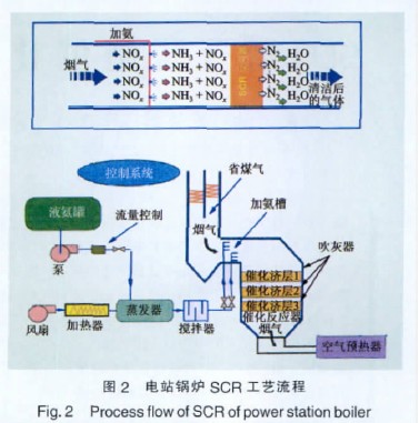 SCR系統由氨供應系統、氨氣/空氣噴射系統、催化反應系統以及控制系統等組成,催化反應系統是SCR工藝的核心,設有NH3的噴嘴和粉煤灰的吹掃裝置,煙氣順著煙道進入裝載了催化劑的SCR反應器,在催化劑的表面發生NH3催化還原成NOx。
