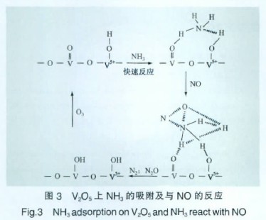 (1)NH3擴散到催化劑表面;(2)NH3在V2O5上發生化學吸附;(3)NO擴散到催化劑表面;(4)NO與吸附態的NH3反應,生成中間產物;(5)中間產物分解成最終產物N2和H2O;(6)N2和H2O離開催化劑表面向外擴散。