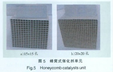 由于SCR反應器布置在除塵器之前,大量飛灰的存在給催化劑的應用增加了難度,為防止堵塞、減少壓力損失、增加機械強度,通常將催化劑固定在不銹鋼板表面或制成蜂窩陶瓷狀,形成了不銹鋼波紋板式和蜂窩陶瓷的結構形式,如圖4、5所示。板式催化劑的生產過程為,將催化劑原料(載體、活性成分與助催化劑)均勻地碾壓在不銹鋼板上,切割并壓制成帶有褶皺的單板,煅燒后組裝成模塊,便于安裝和運輸[5]。蜂窩式催化劑的主要生產步驟為,將3種化學原料與陶瓷輔料攪拌,混合均勻,通過擠出成型設備按所要求的孔徑制成蜂窩狀長方體,進行干燥和煅燒,再切割成一定長度的蜂窩式催化劑單體,組裝成模塊。板式與蜂窩式催化劑的綜合比較如表1所示。