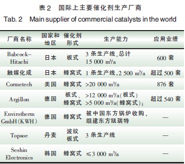 SCR工藝自1978年在日本成功地實現工業應用以后,工藝技術與催化劑的生產技術一直在不斷地進步與完善,形成了由觸媒化成與界化學為代表的蜂窩式和以Babcock-Hitachi為代表的板式2種主流結構與技術,在本國的生產能力并沒有太多擴大,可是技術已經向美國、歐洲及亞洲的韓國、中國臺灣省及中國內地輸出。目前各主要生產商生產的SCR催化劑及產量如表2所示。